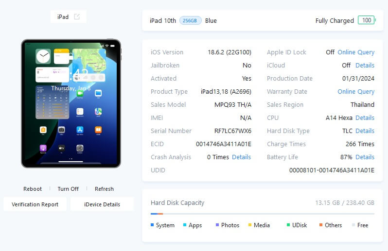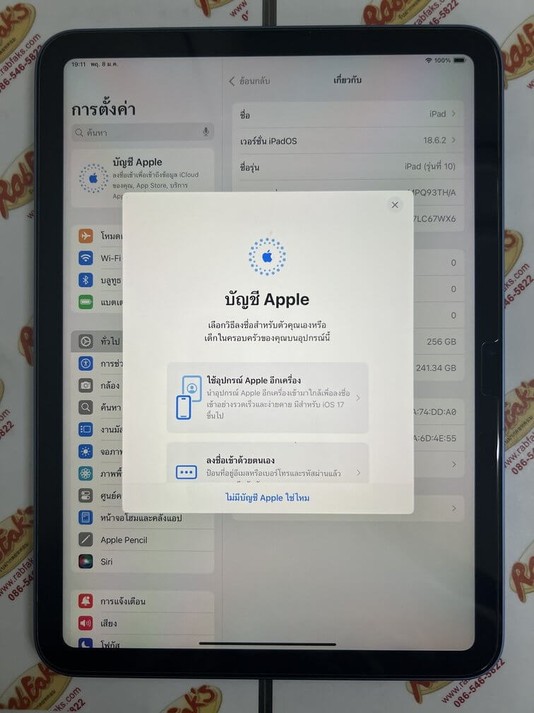 ขายถูก iPad Gen 10 WiFi 256GB(ความจำเยอะ) สภาพสวย92% สุขภาพแบต87% สีBlue เครื่องศูนย์ไทย อุปกรณ์ไม่มีนะครับ ไม่ติดiCloud ประกันหมดแล้ว